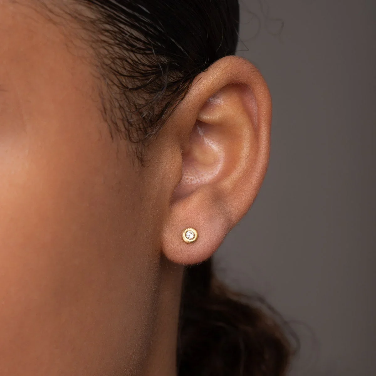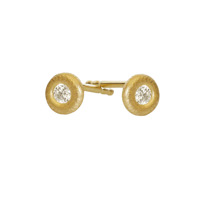 Ørepynt i 18k gult gull med en diamant (totalt 0,08 ct). Diamantene er fattet i en sirkel av gull med en håndfilt, riflet overflate.