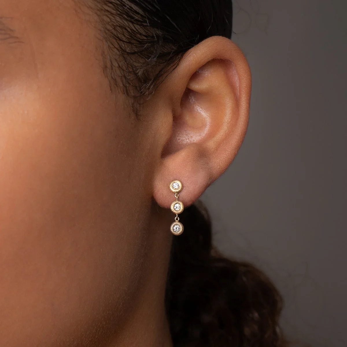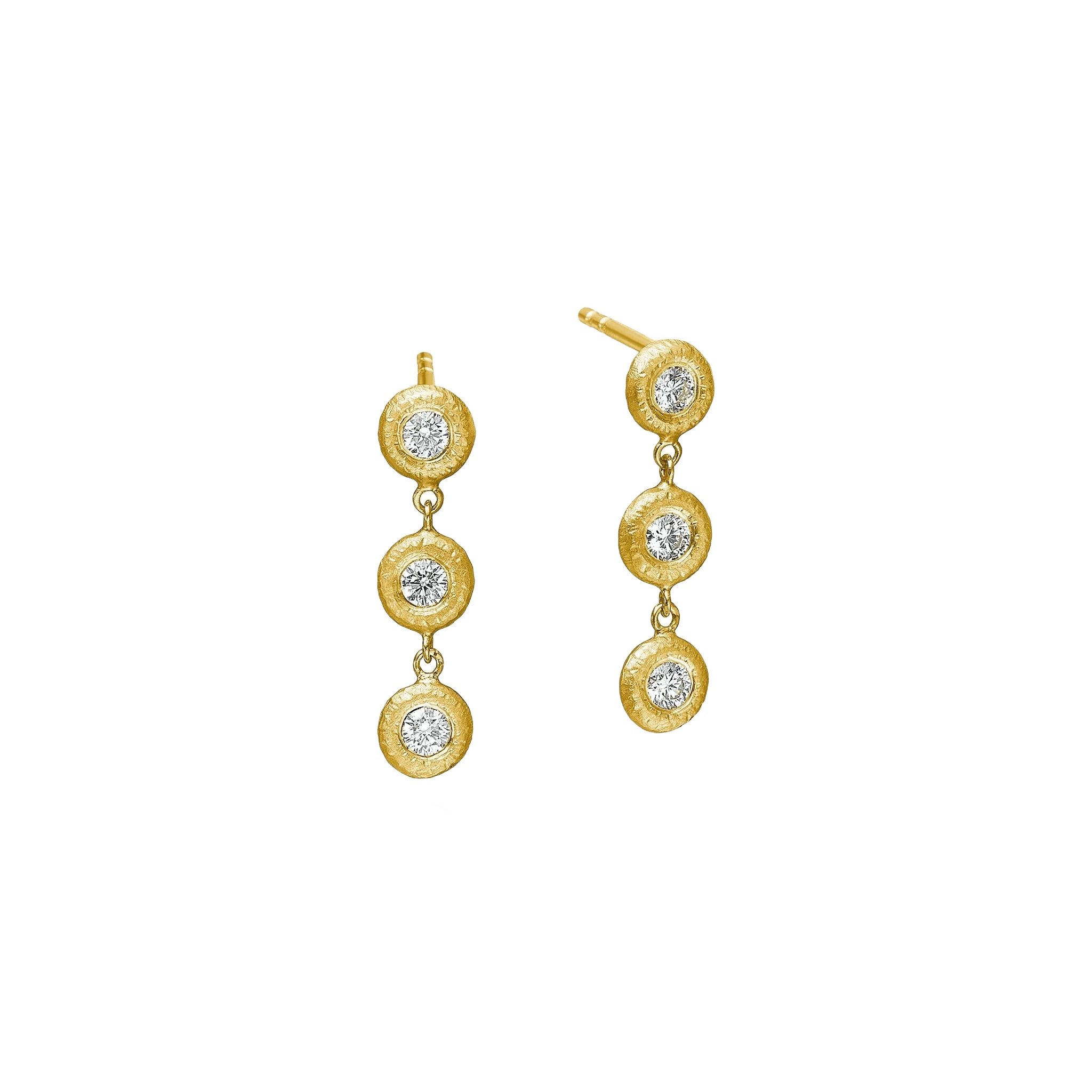 Elegante ørepynt i 18k gult gull med tre diamanter i alt 0,12ct på rekke (totalt 0,24 ct). Diamantene er fattet i en sirkel av gull med en håndfilt, riflet overflate.