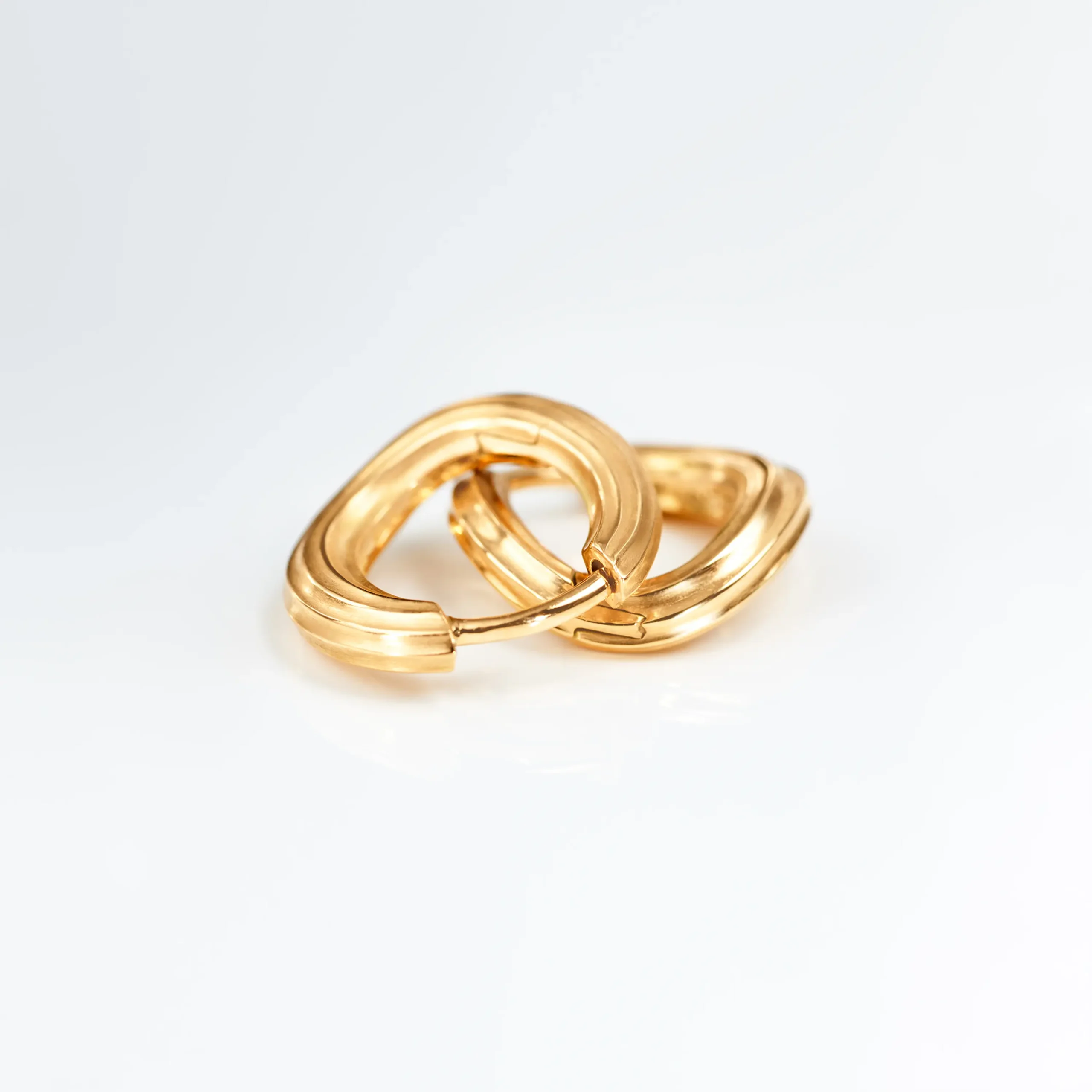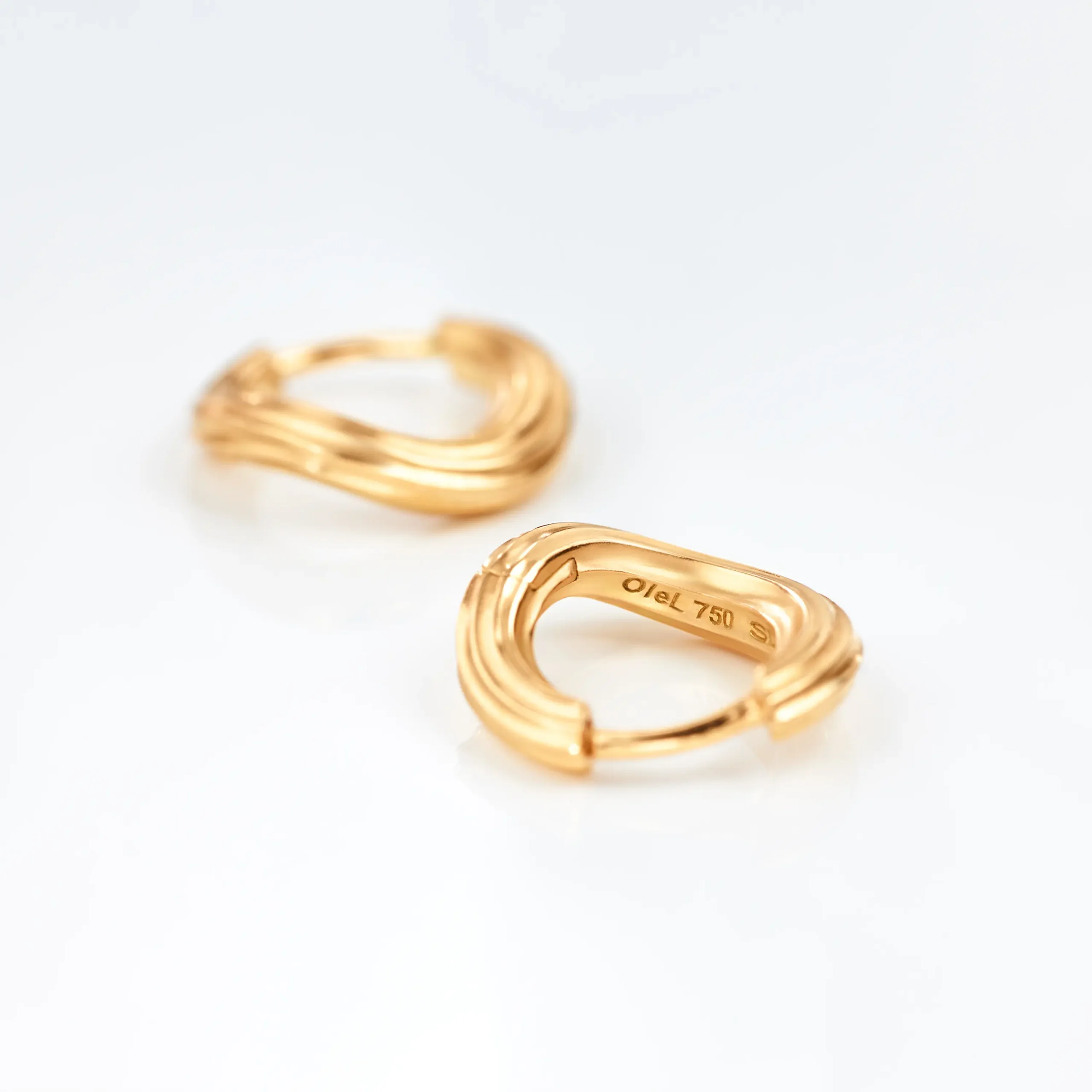Øreringer laget i 18k gult gull. Formene og overflaten er inspirert av de organiske bevegelsene i havet og strukturene i sanden. Designet blander styrke med komfort, og er et ekko av havets endeløshet.